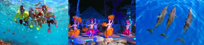 イルカウォッチングまたはシュノーケリングとディナーショーをセットでお申込み頂くと、大人お一人様 $20以上もお得になるプラン。昼も夜もお楽しみ頂けるフィッシュアイマリンパークです。